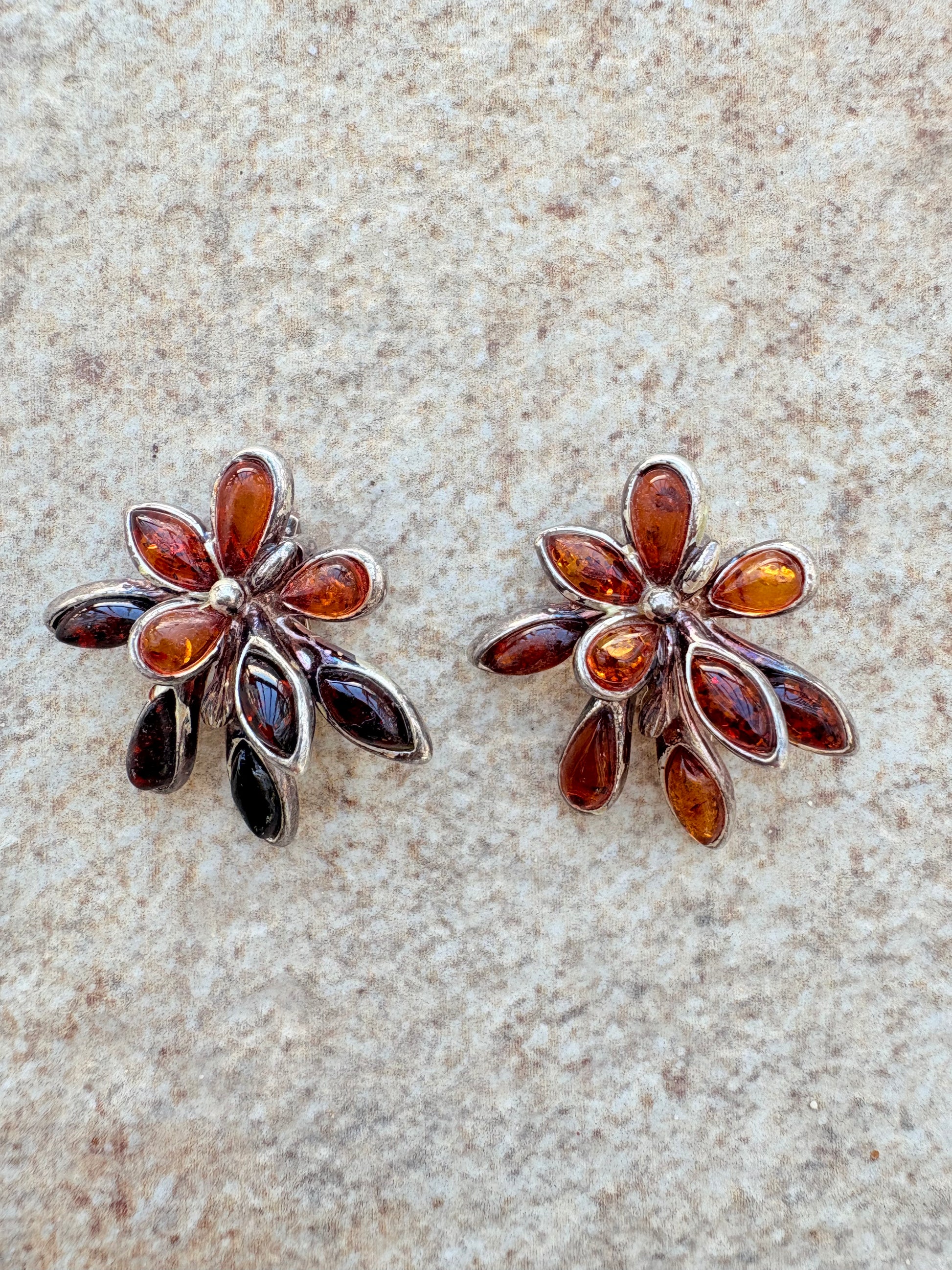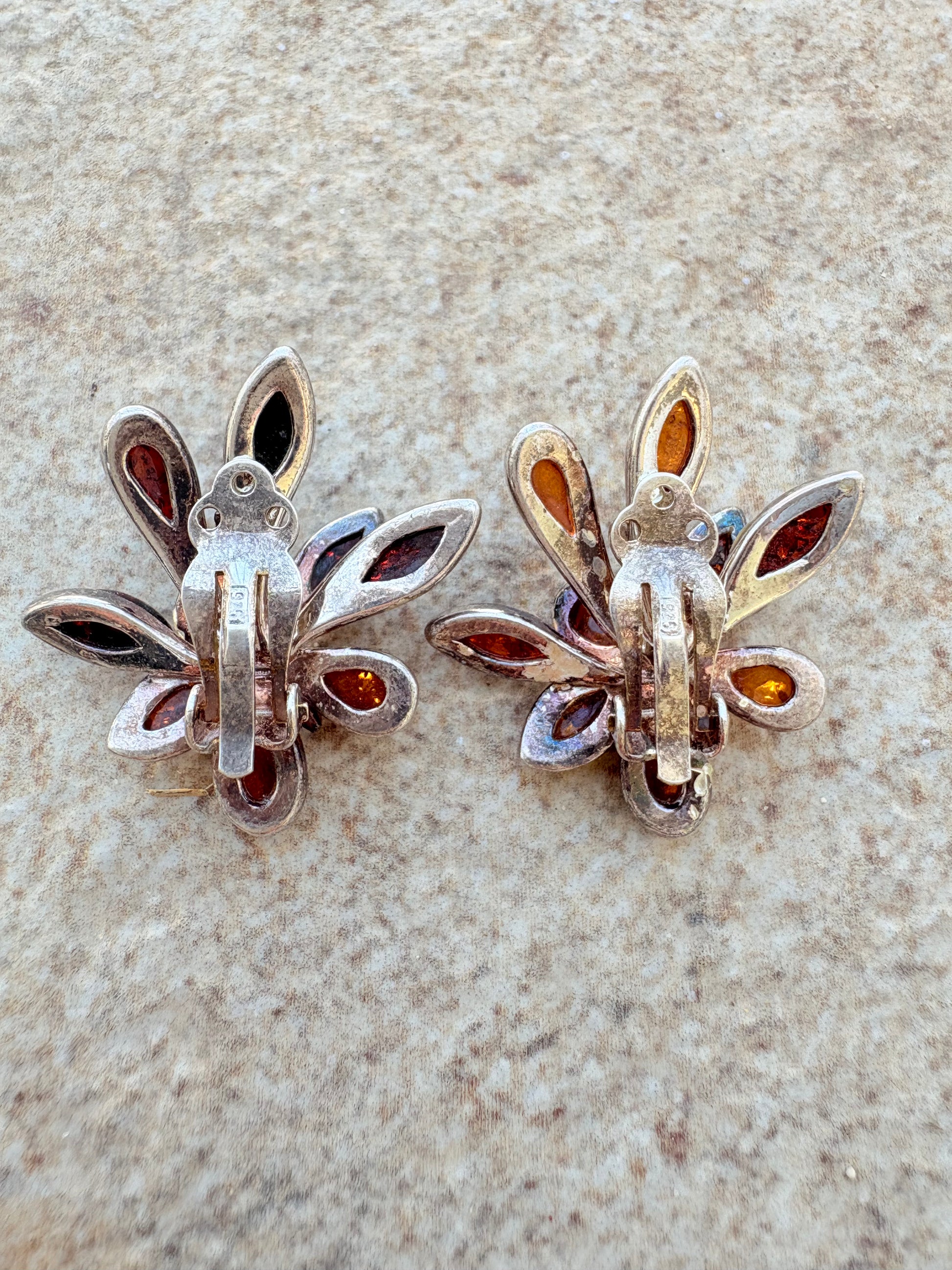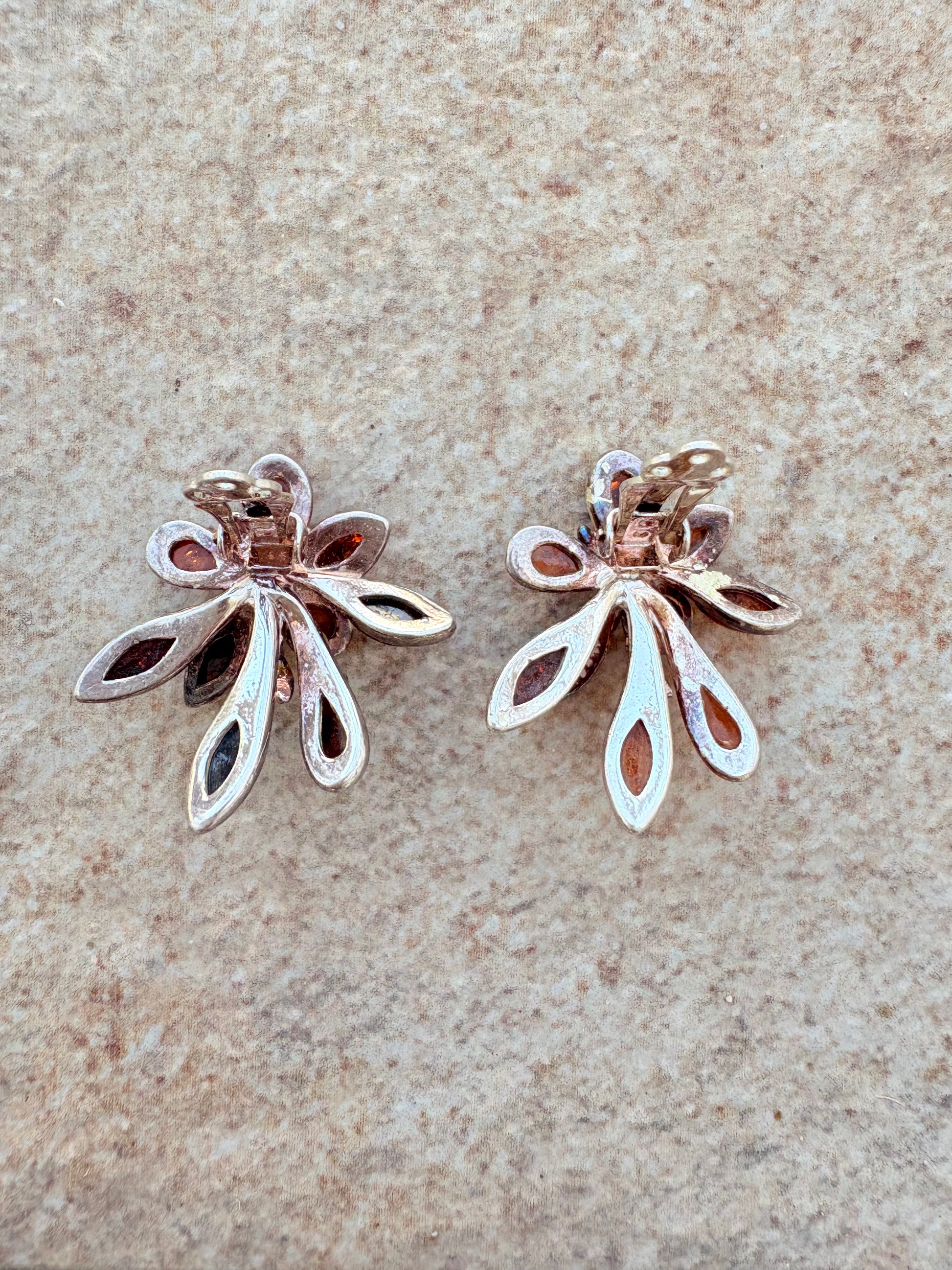 Vintage Sterling Silver Amber Floral Clip-On Earrings | Teardrop Petals