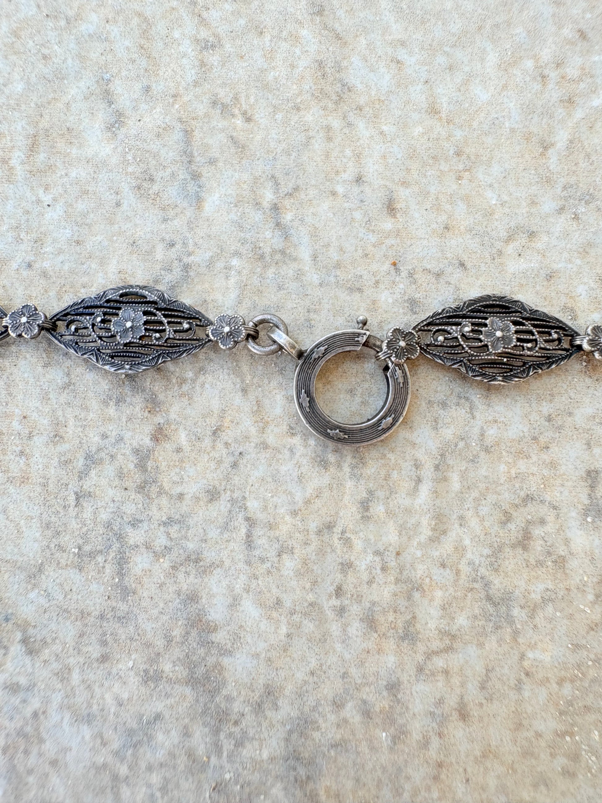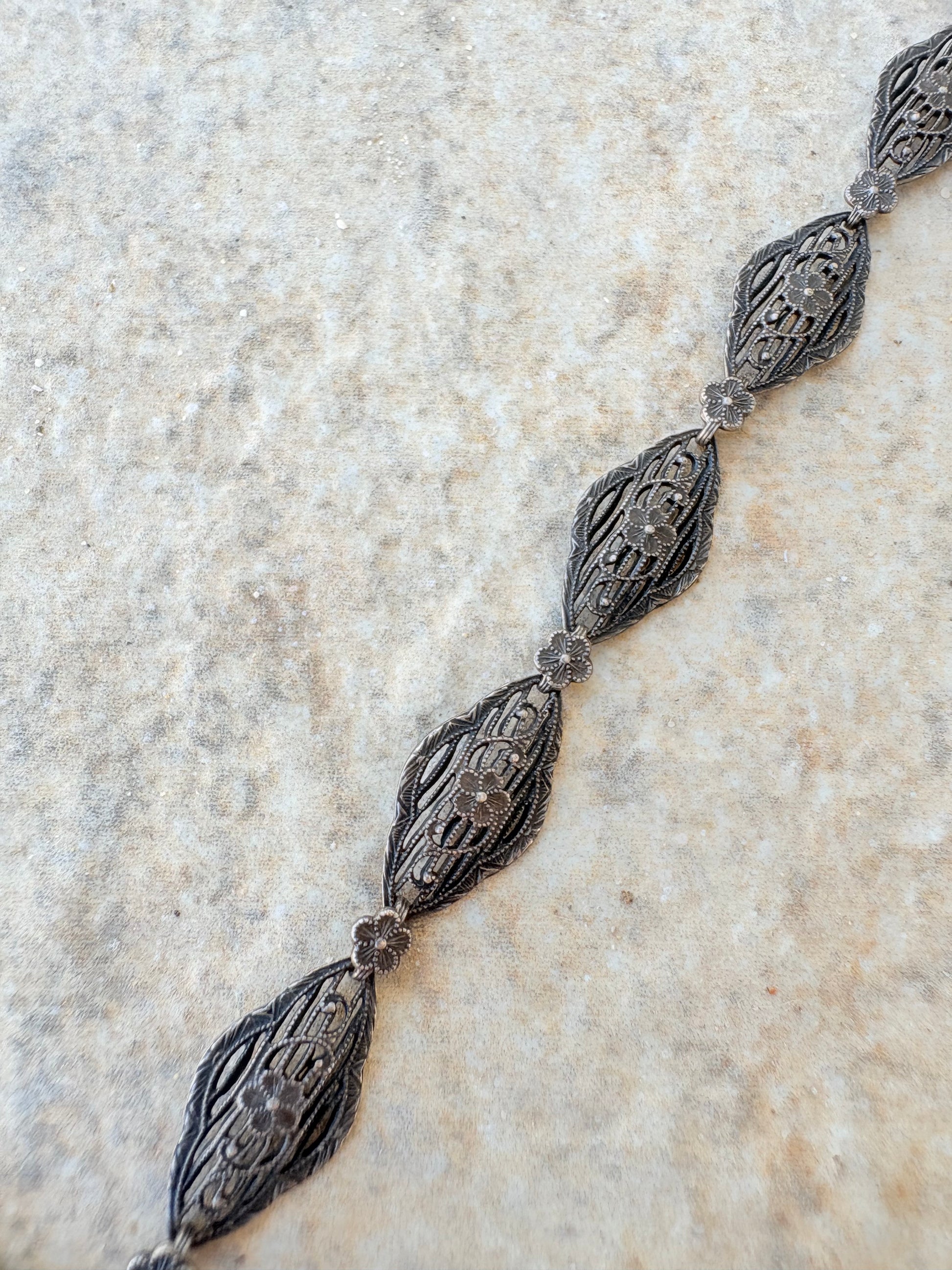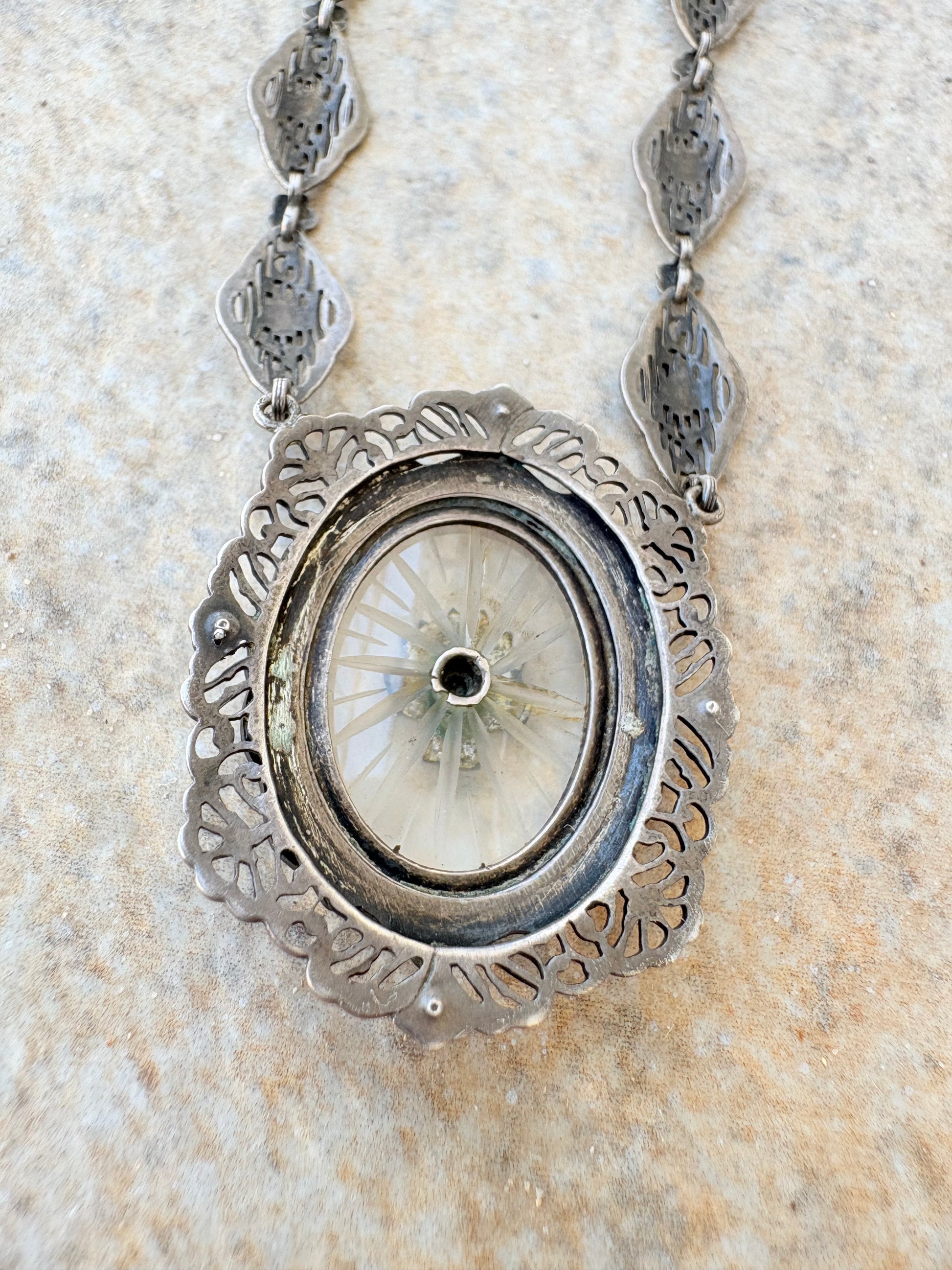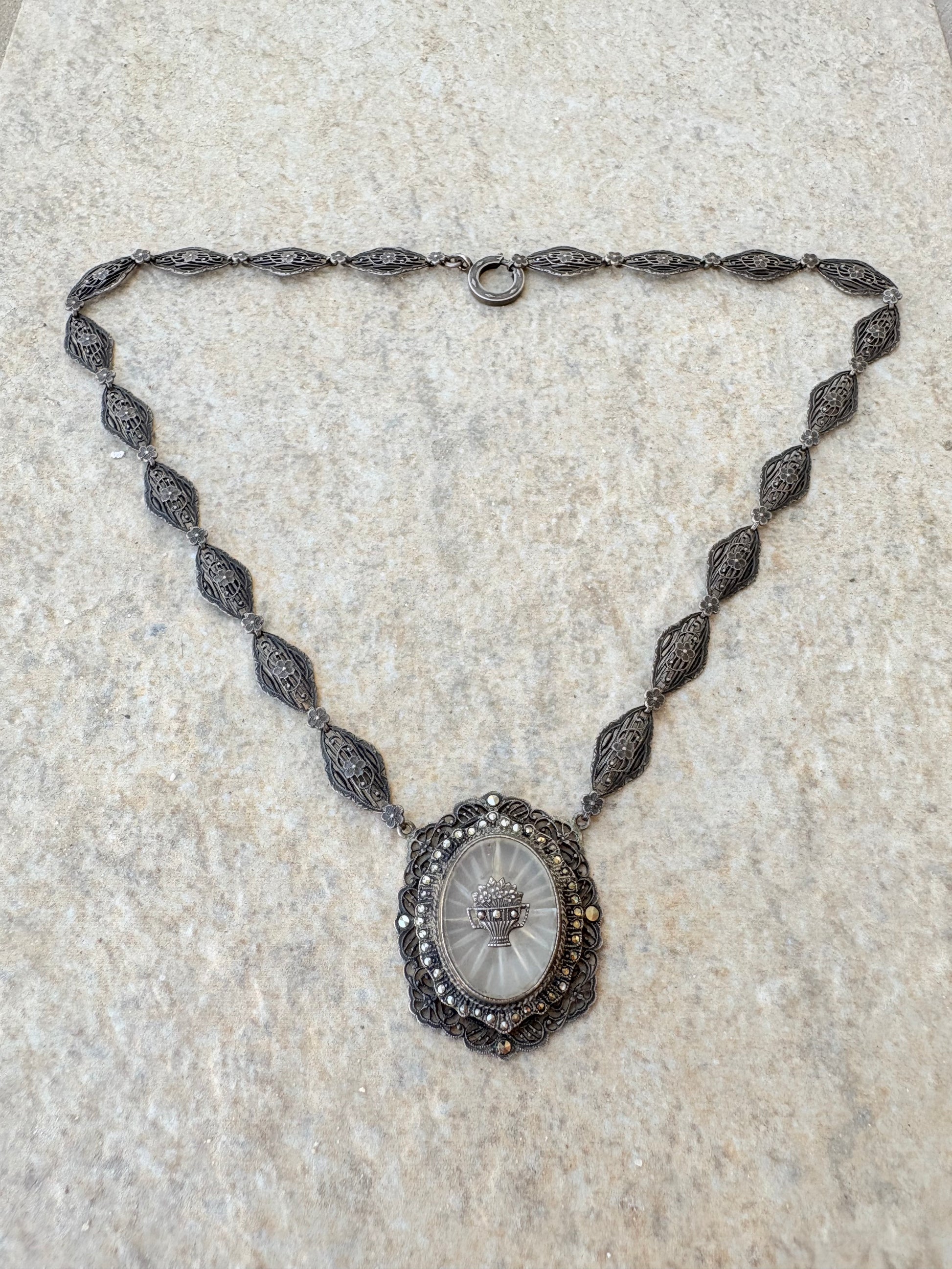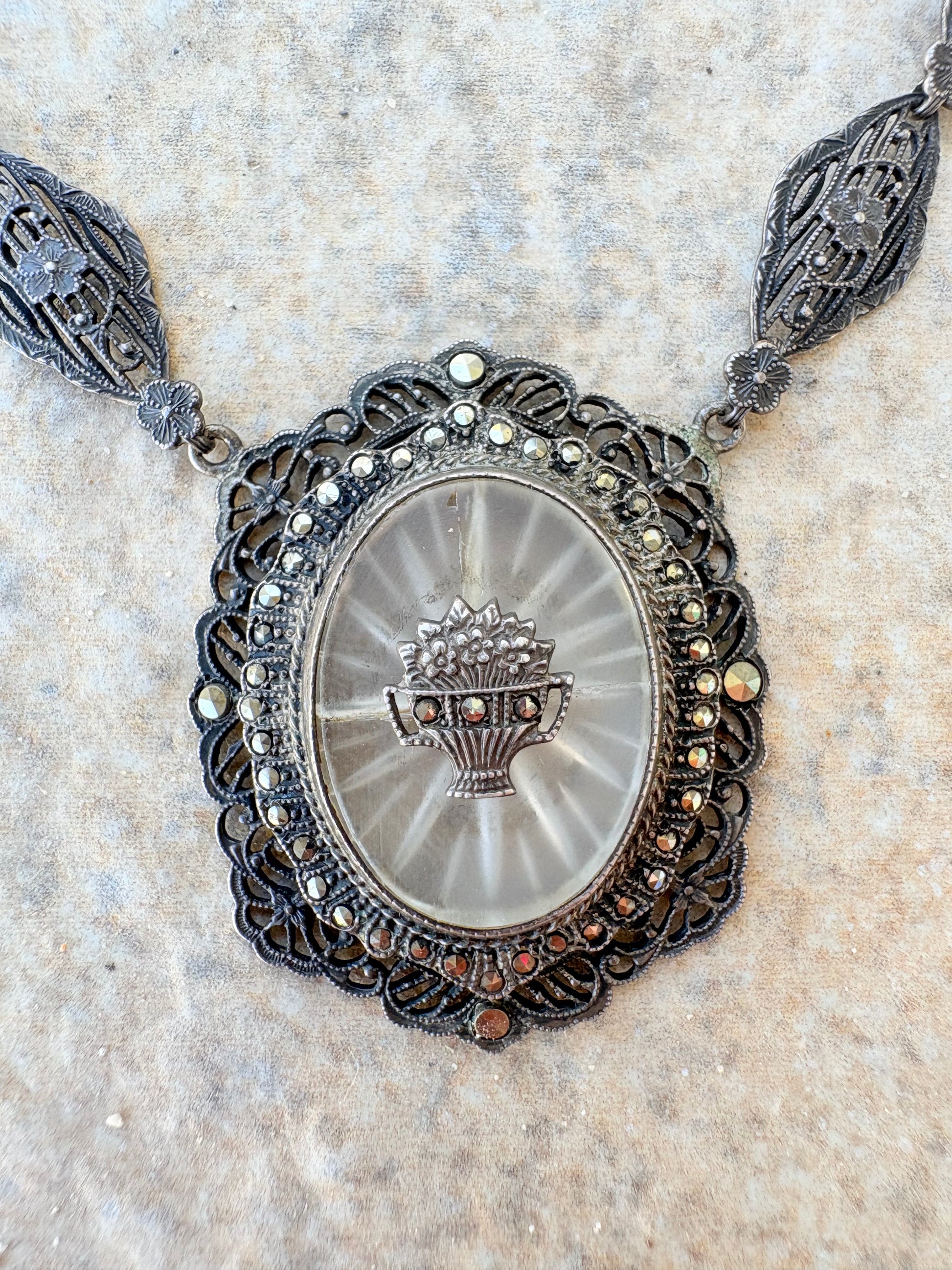 Step into the elegance of the 1920s with this breathtaking vintage Art Deco filigree panel link necklace, featuring an etched glass intaglio centerpiece framed by marcasite-encrusted filigree. The etched intaglio depicts a floral basket — a motif rich in symbolic grace.