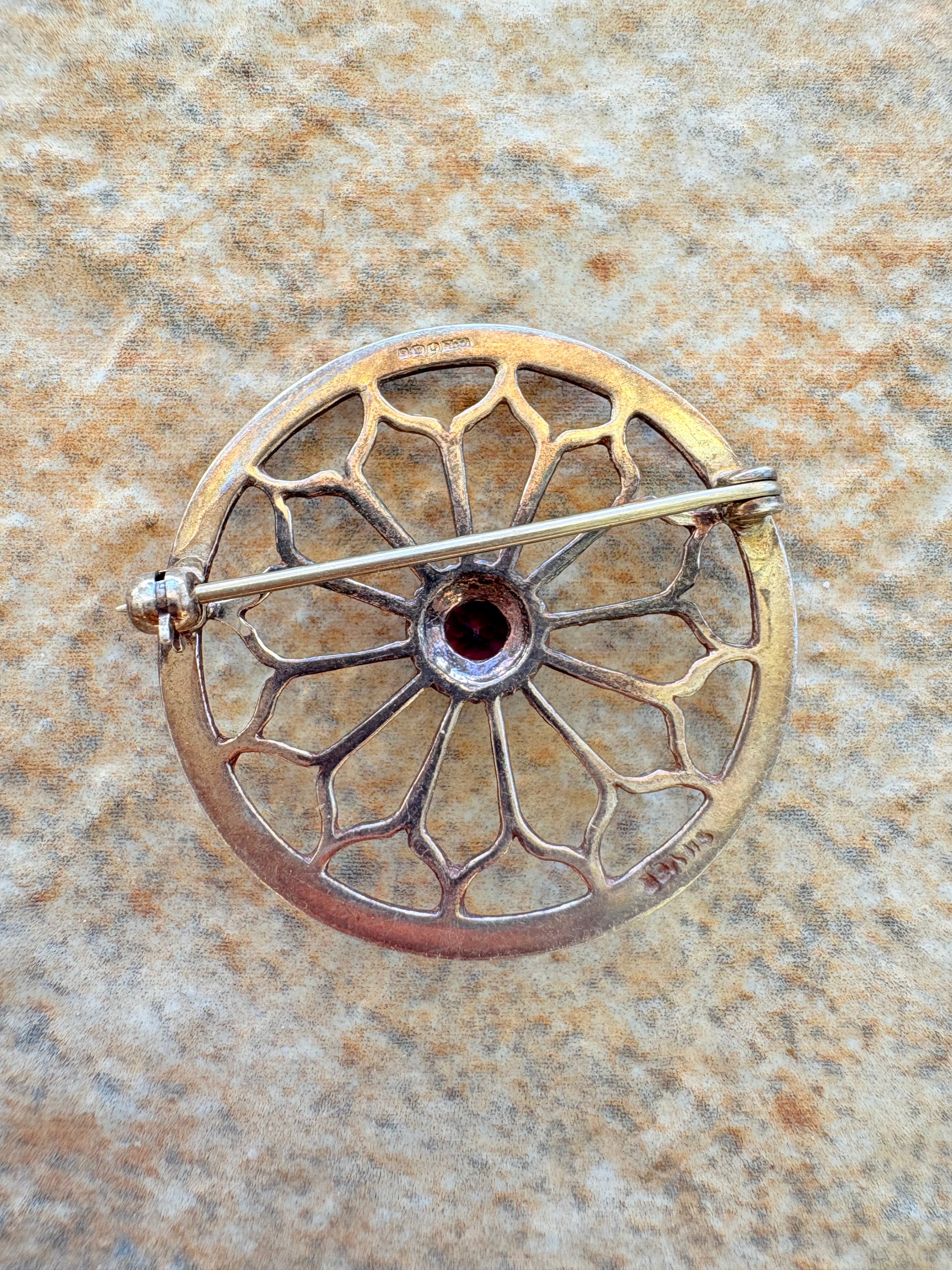This exquisite antique brooch features a delicate web-like sterling silver design with an Art Nouveau sensibility, crowned at the center with a vibrant amethyst stone. The radial, organic form resembles the petals of a flower or the spokes of a celestial wheel, echoing natural beauty and timeless craftsmanship.
