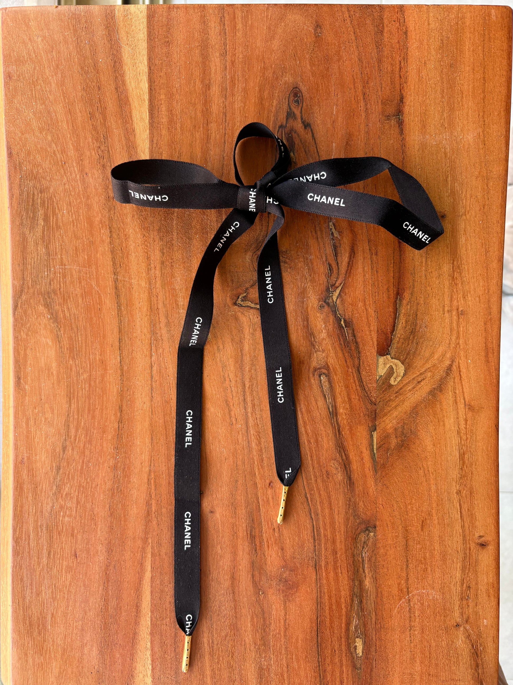 Turn everyday style into a statement with this authentic Chanel ribbon, beautifully upcycled with sleek metal tips for versatility and luxury. Originally from Chanel packaging, this ribbon has been thoughtfully transformed into a multi-use accessory that can be worn as shoelaces, threaded through a hoodie, or styled as a chic hair ribbon.