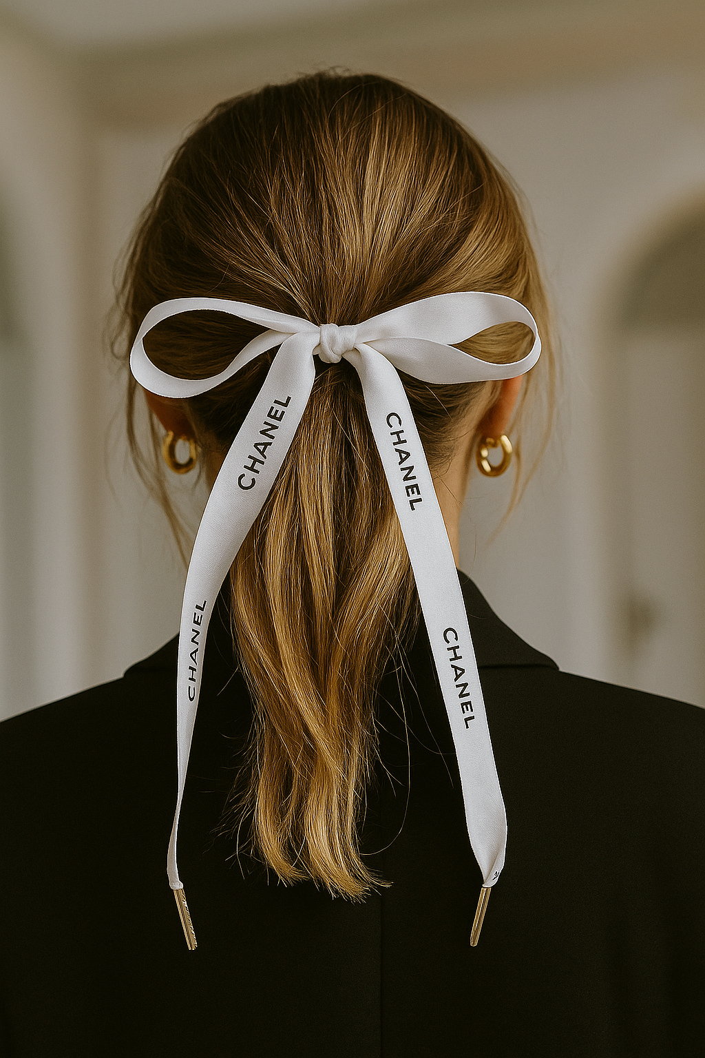 Turn everyday style into a statement with this authentic Chanel ribbon, beautifully upcycled with sleek metal tips for versatility and luxury. Originally from Chanel packaging, this ribbon has been thoughtfully transformed into a multi-use accessory that can be worn as shoelaces, threaded through a hoodie, or styled as a chic hair ribbon.