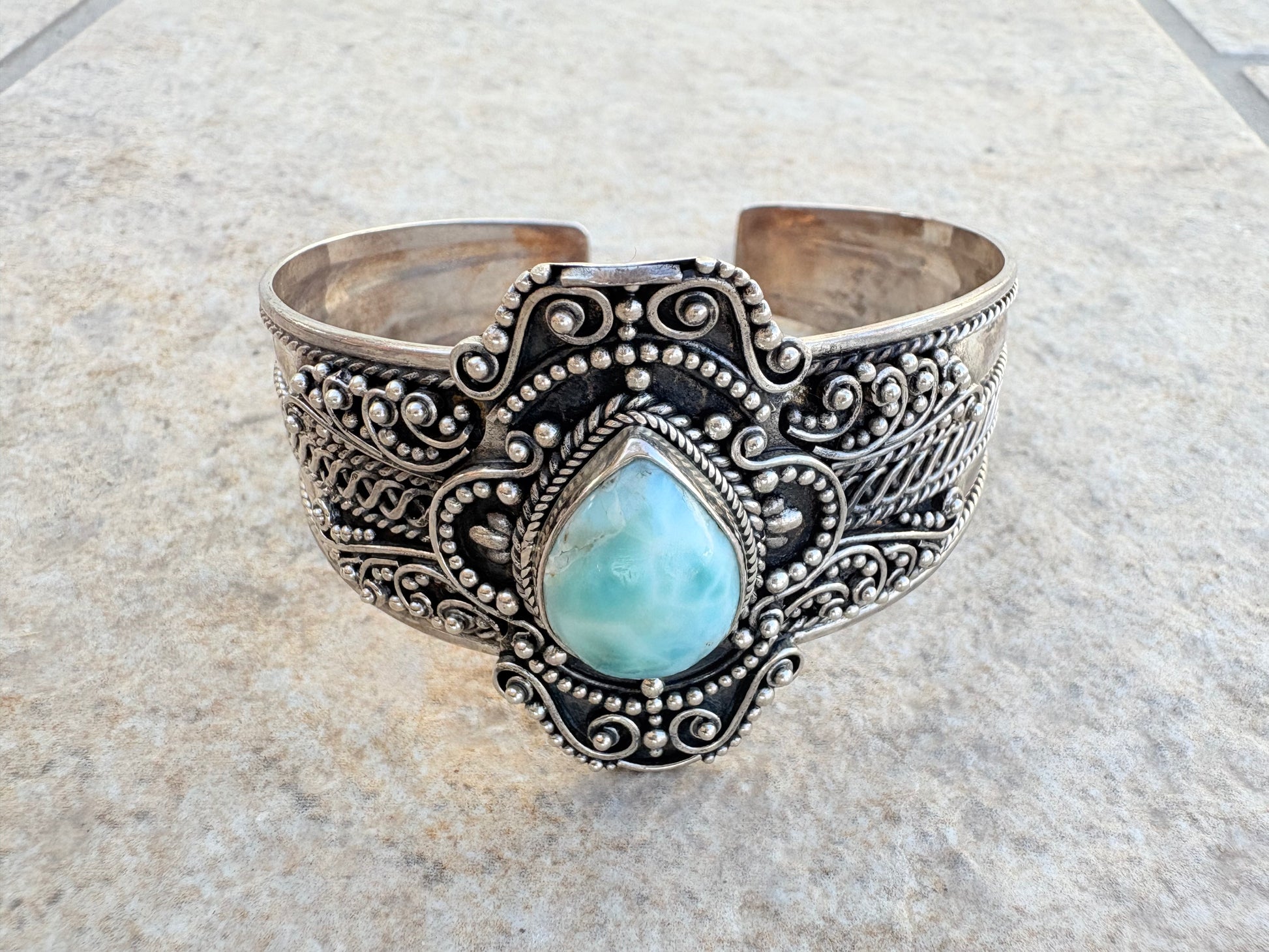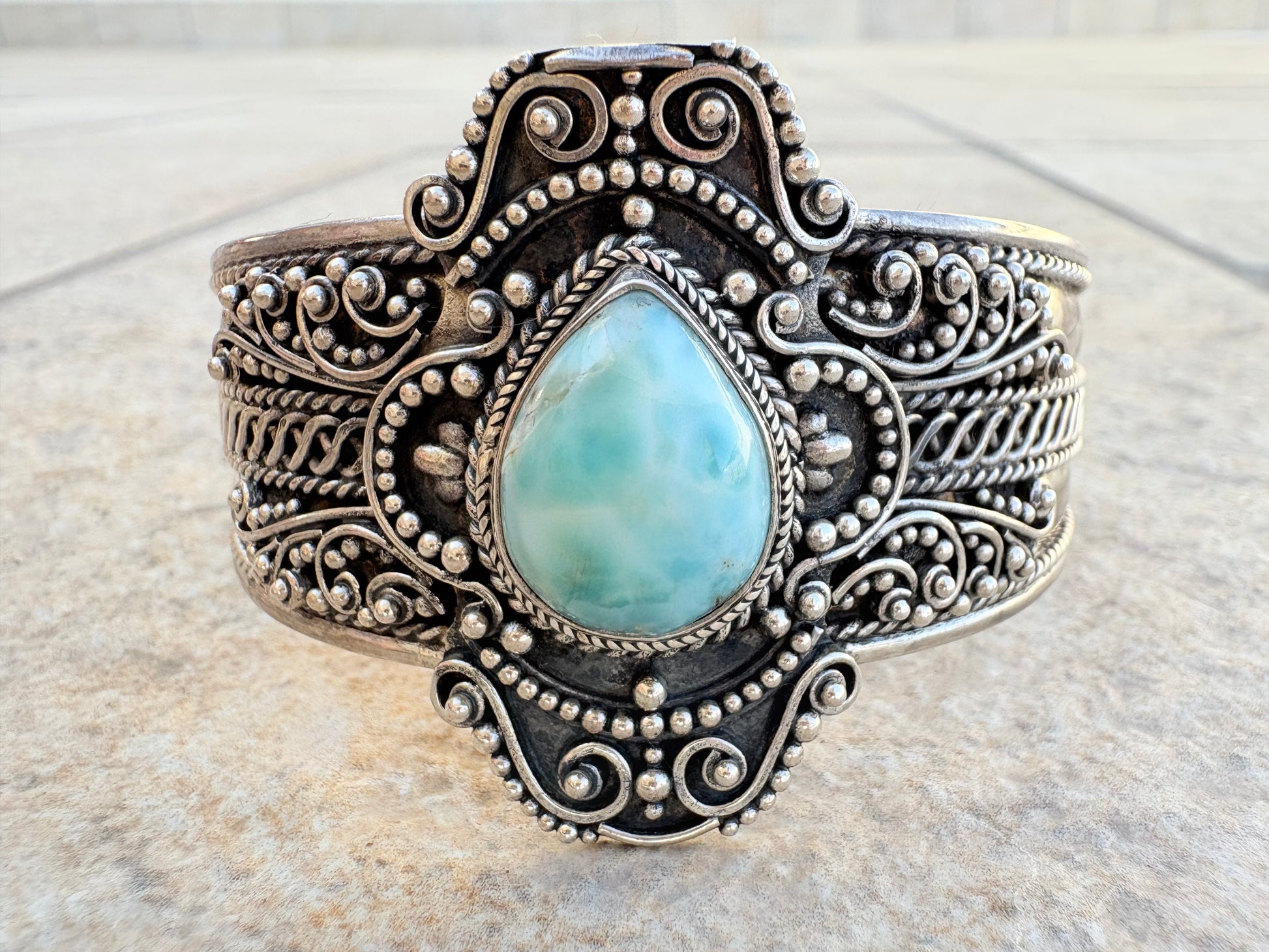 Make a statement with this exquisite sterling silver cuff bracelet, featuring a striking teardrop larimar stone at its center. Known as the “stone of the Caribbean,” larimar radiates serene hues of ocean blue with soft white marbling, believed to embody tranquility and balance.