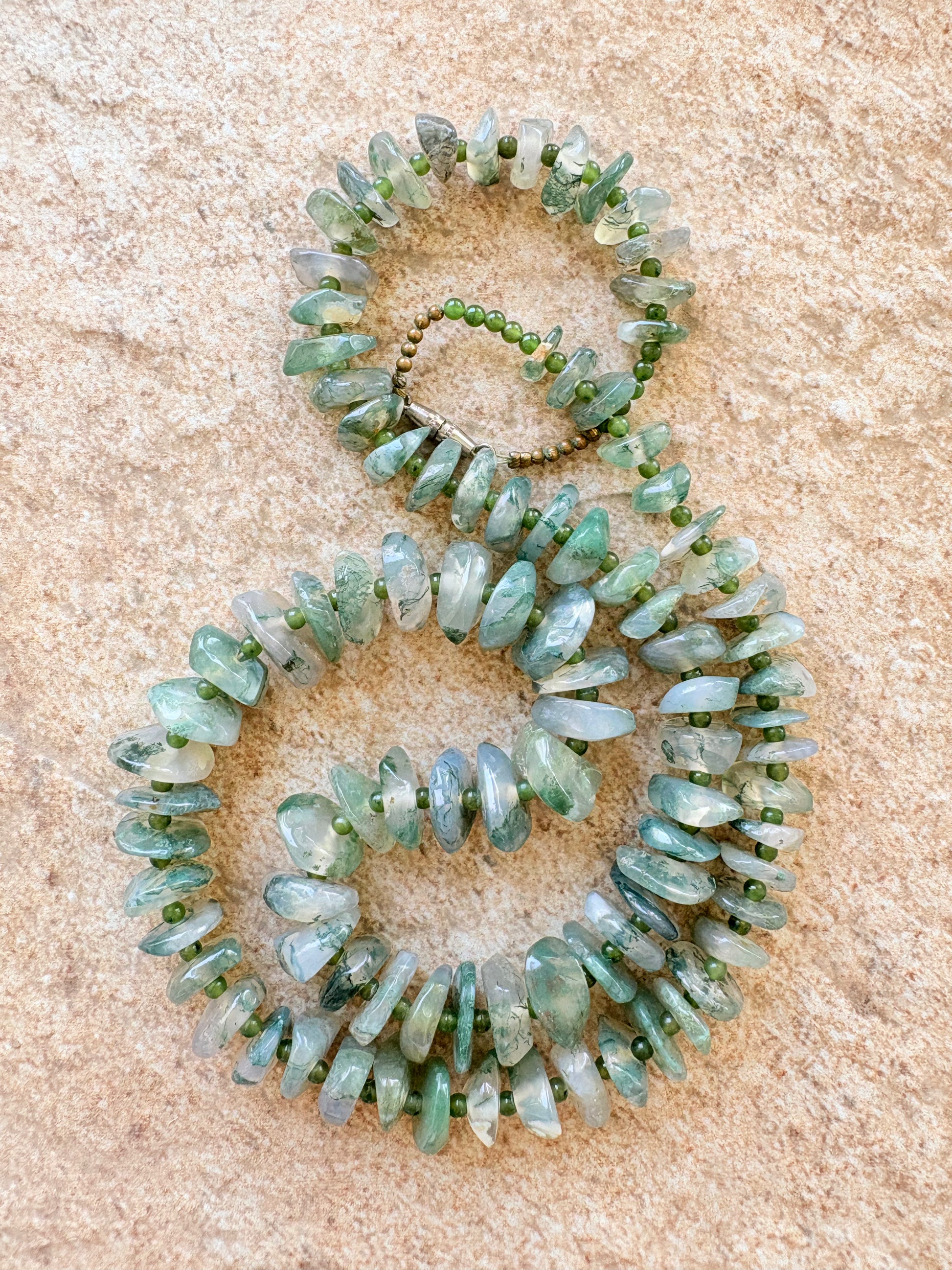 Bring the grounding beauty of nature to your jewelry collection with this stunning vintage Moss Agate necklace. Featuring polished, organic-shaped moss agate nuggets in soothing green and translucent tones, this piece feels like wearing a piece of the forest close to your heart.