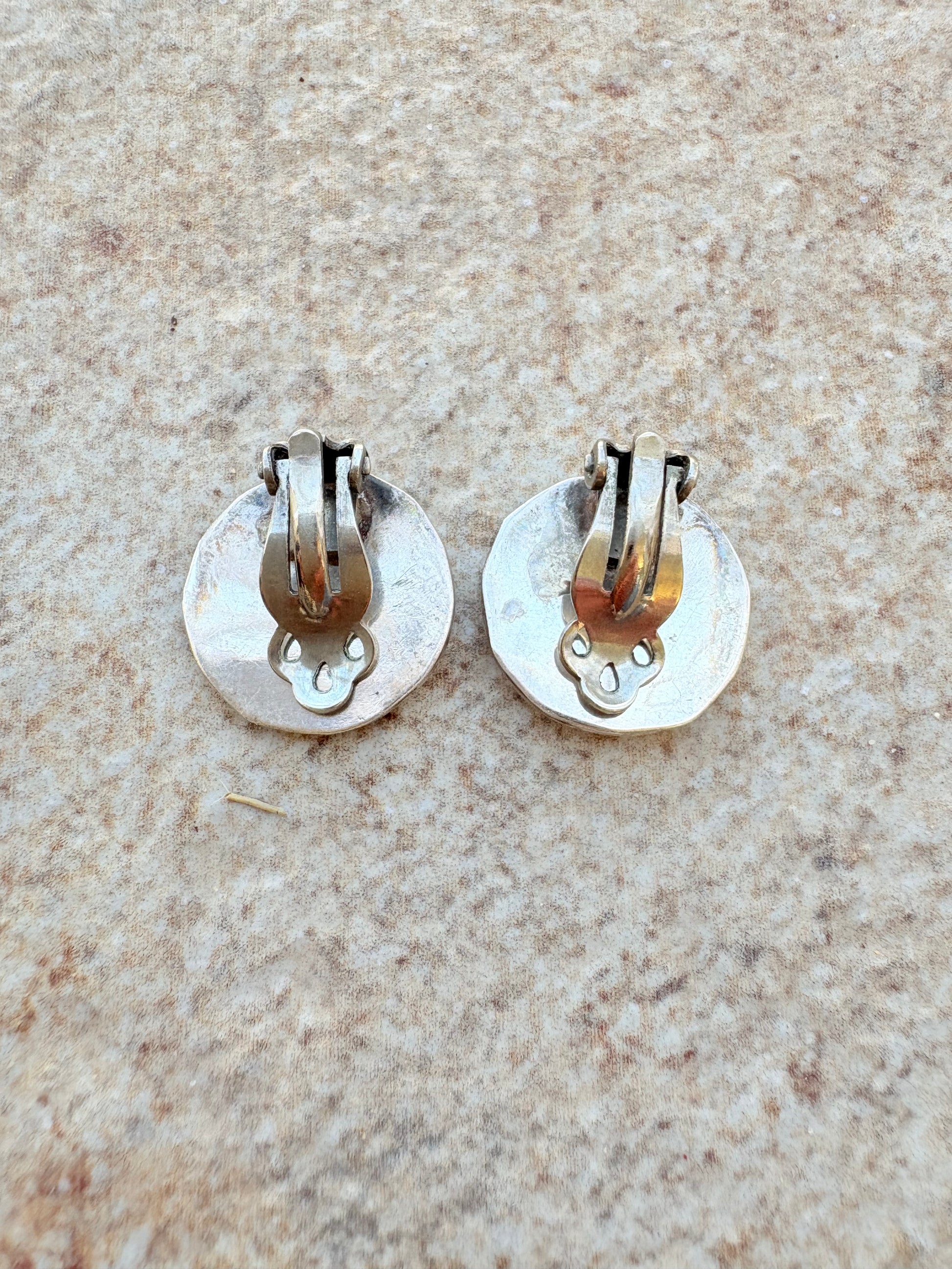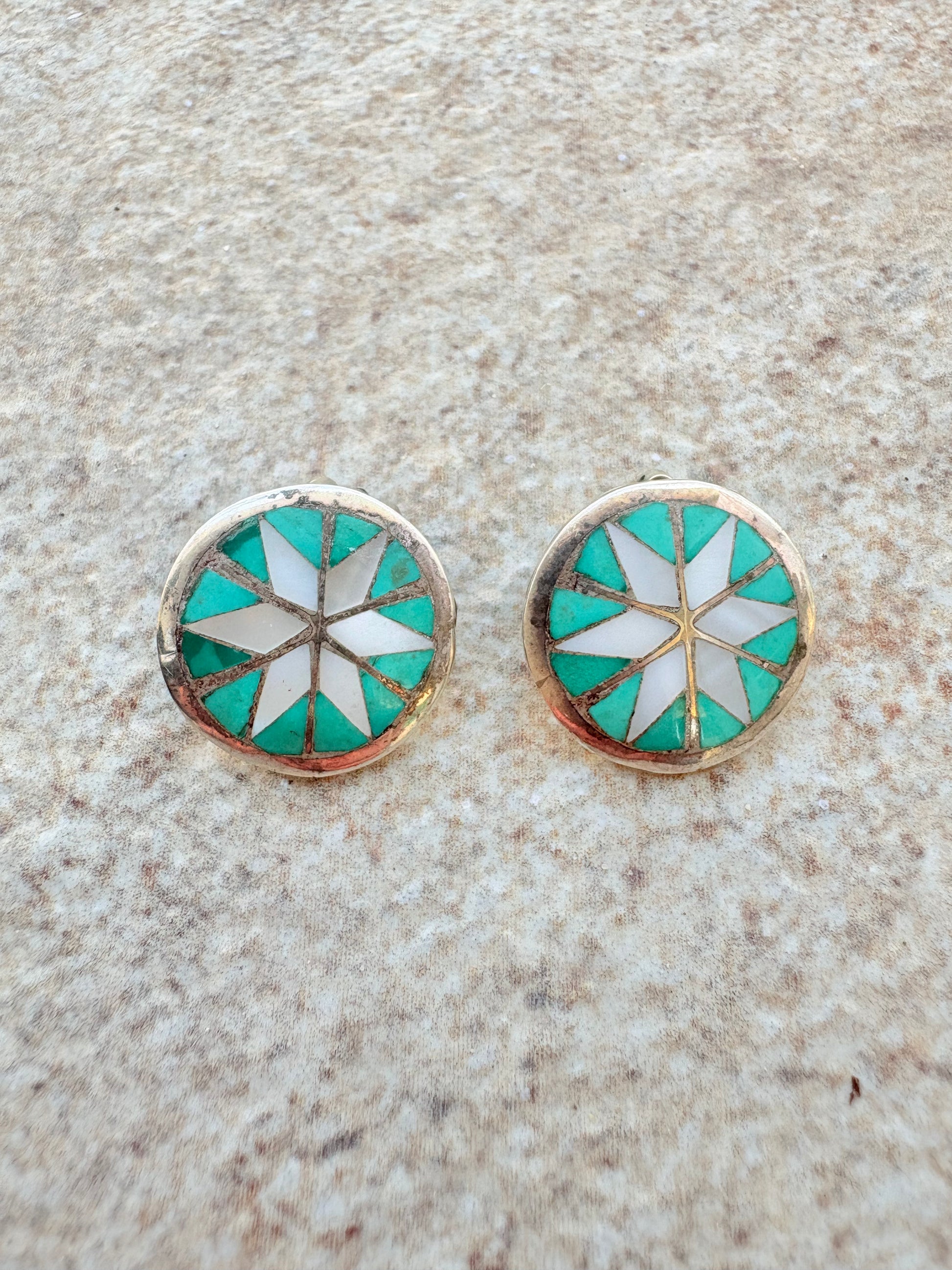 A true celebration of artistry and tradition — these vintage sterling silver clip-on earrings feature a stunning hand-inlaid design of turquoise and mother-of-pearl. Radiating in a geometric starburst pattern, they reflect the influence of Native American craftsmanship and Southwest style.