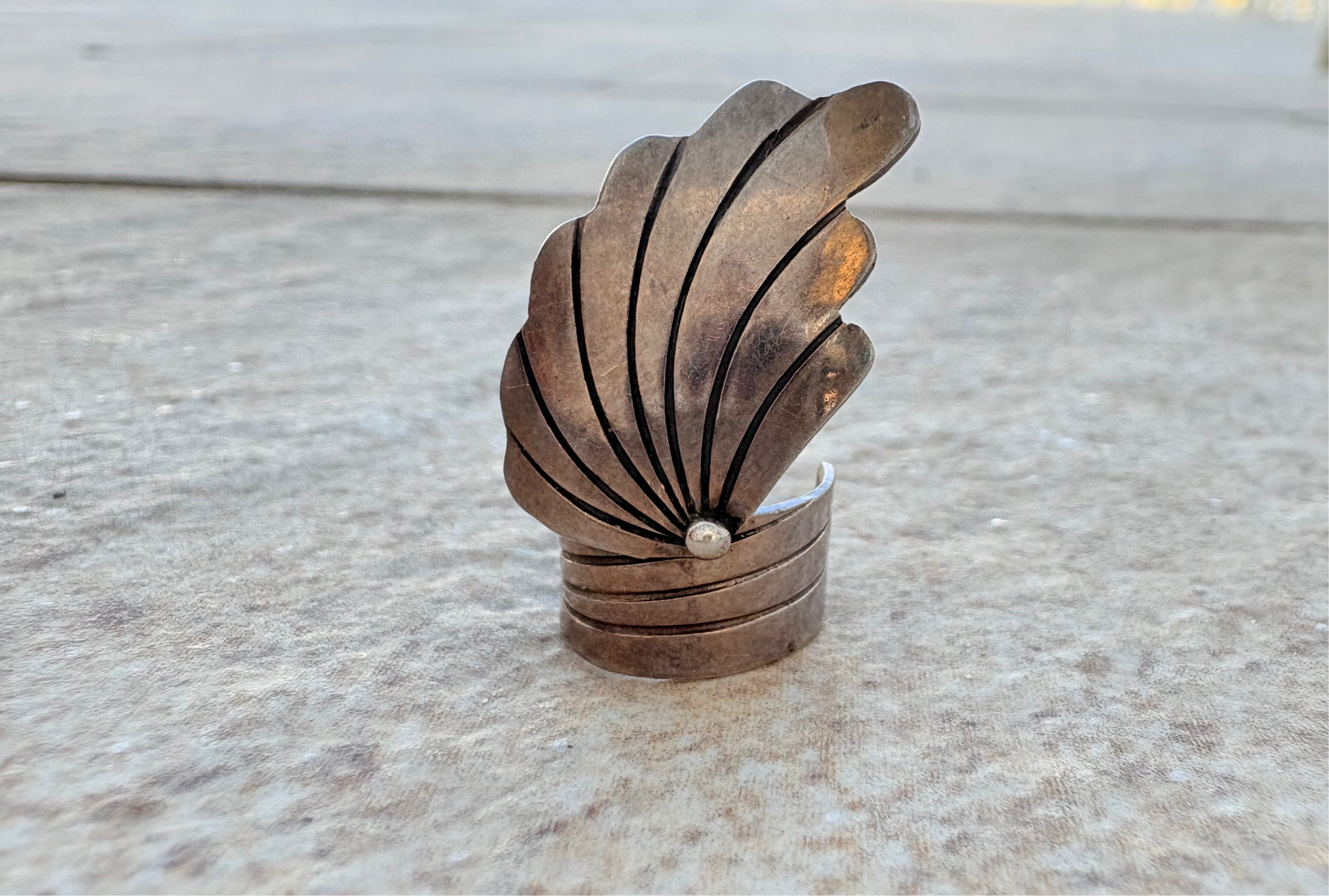 Elevate your jewelry collection with this vintage Native American sterling silver ear cuff, beautifully hand-formed into a striking feather motif. The bold fan-like feather design radiates upward, accented by engraved lines and a small silver bead at the base, symbolizing strength and connection to nature.
