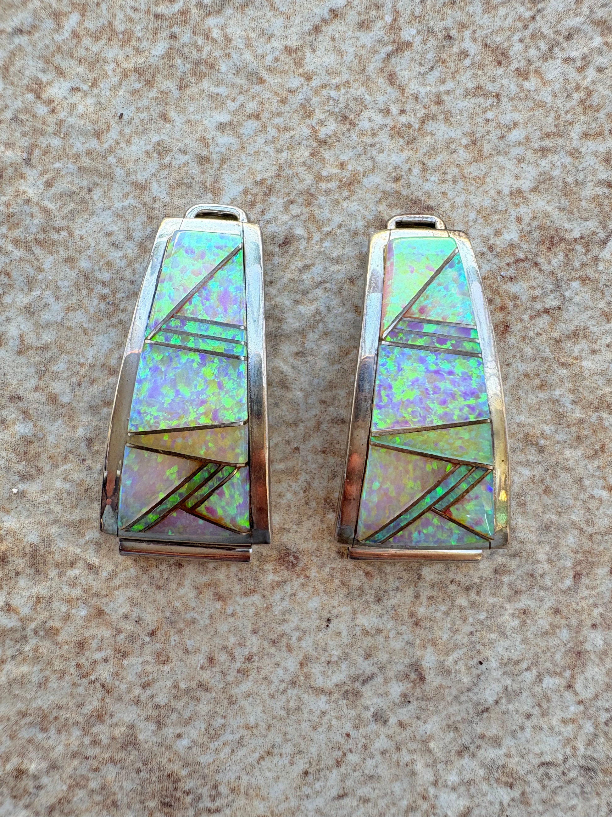 A rare and radiant find, these handcrafted Native American watch tips are a true testament to Southwest artistry. Signed by respected silversmith M. Spencer, the sterling silver tips feature vibrant opal inlay, flashing with blue, green, and fire-pink iridescence.