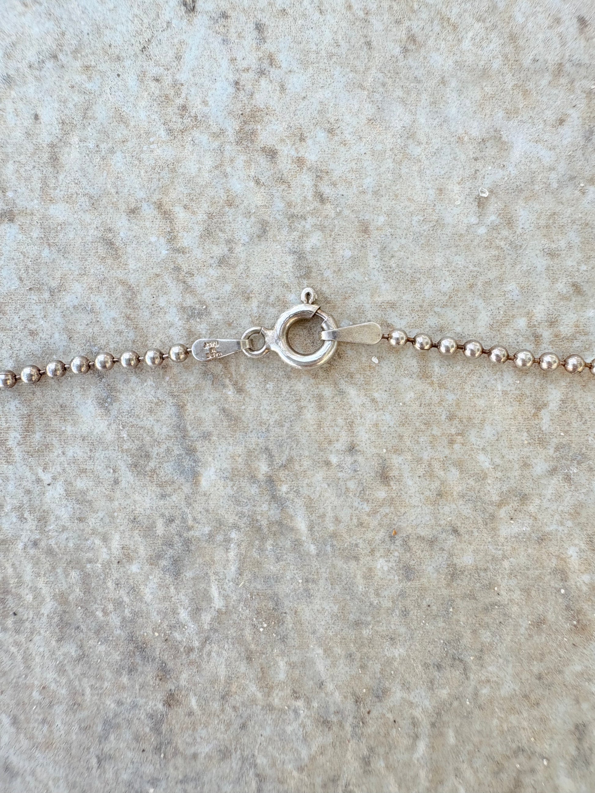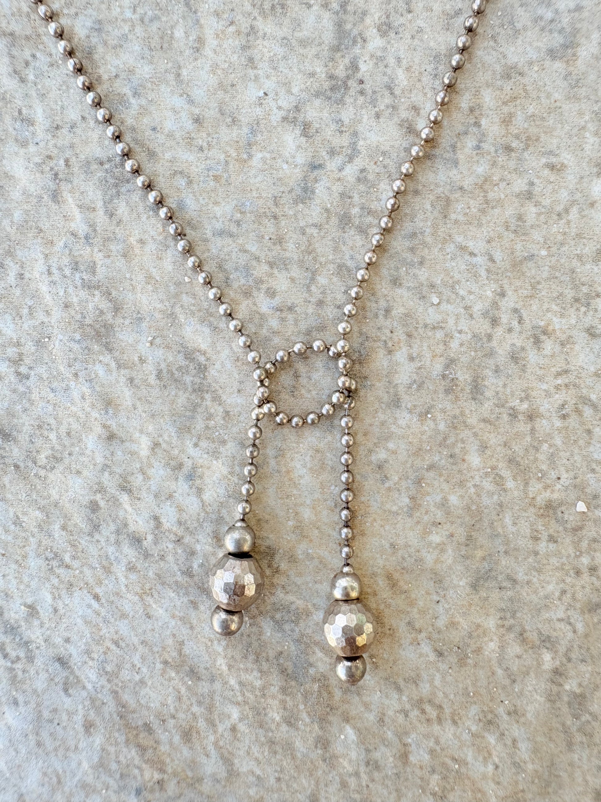 Effortlessly sleek and endlessly wearable, this vintage sterling silver lariat necklace brings a minimalist, sculptural elegance to any outfit. The strand is composed of polished silver beads, gracefully looping into a fixed ring that anchors two faceted drop dangles — adding subtle sparkle with every movement.