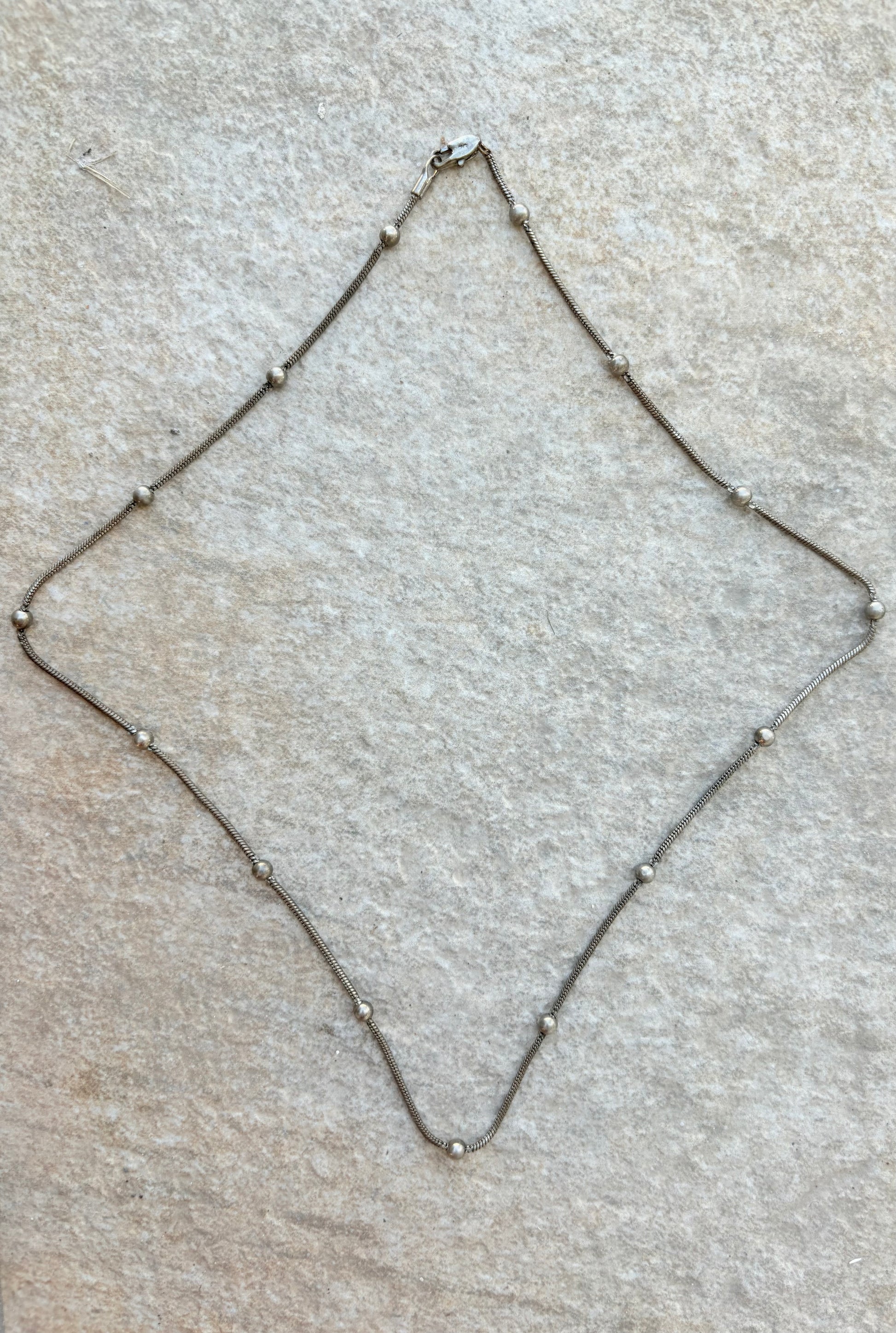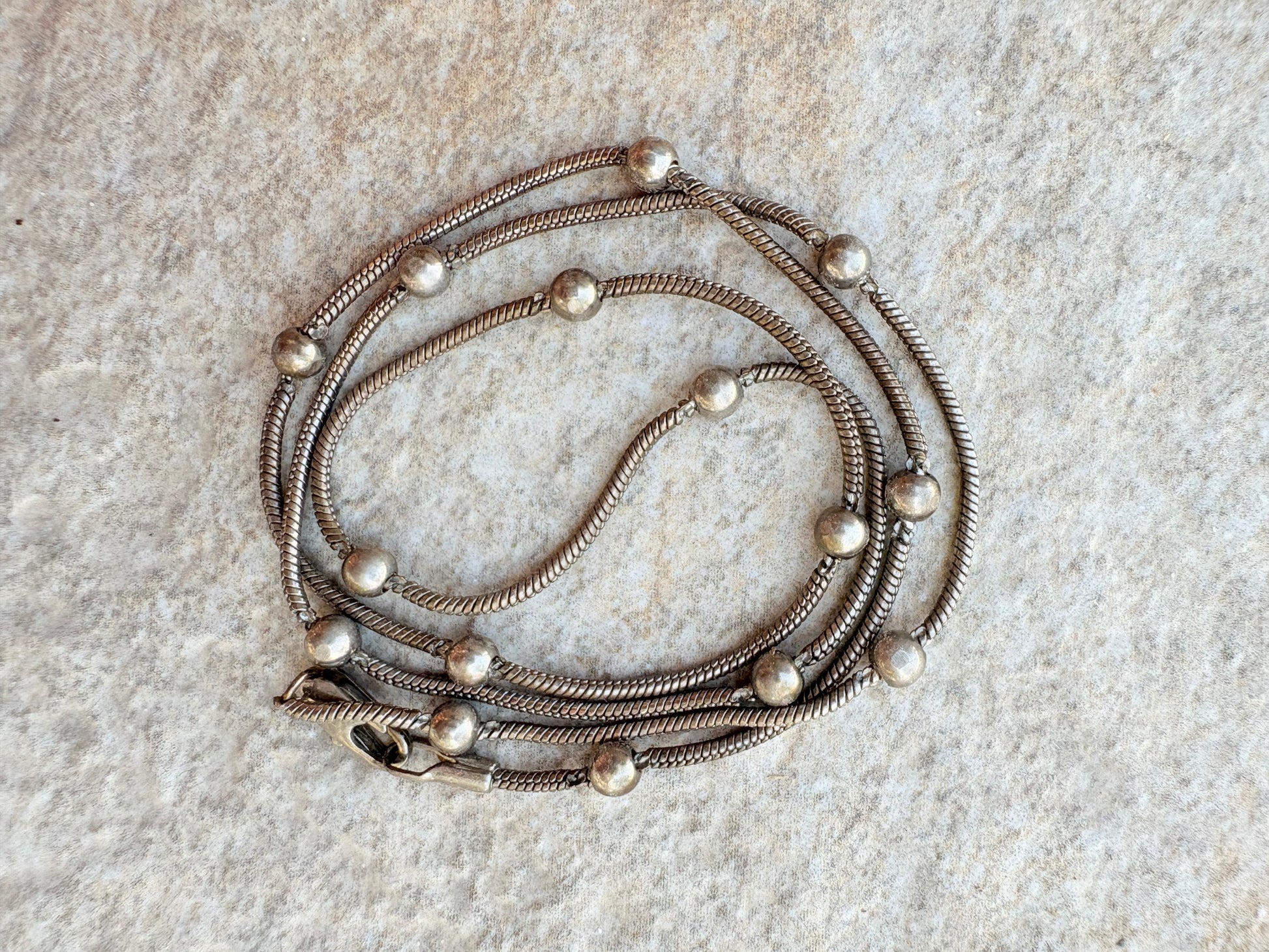 A timeless treasure, this vintage sterling silver necklace features a sleek snake chain adorned with polished silver beads spaced throughout. Its fluid design drapes beautifully, catching the light with every movement, while the handcrafted detailing speaks to skilled artisan work from a bygone era.