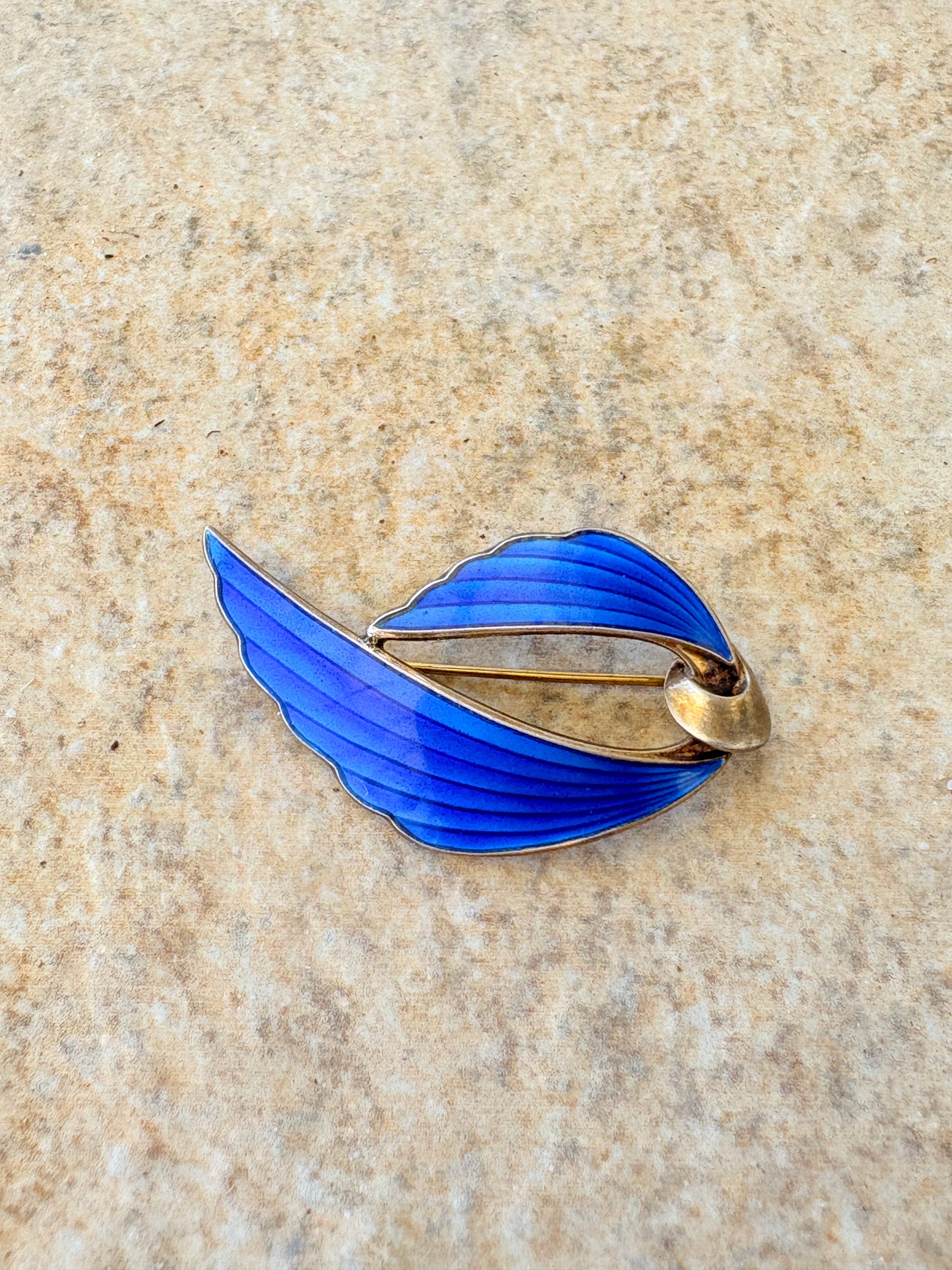 A breathtaking example of mid-century Norwegian enamel artistry, this vintage Albert Scharning sterling silver brooch showcases the luminous guilloché enamel work that Scandinavian jewelers are celebrated for. The flowing, leaf-like form features radiant shades of cobalt and sapphire blue, shimmering with depth as light moves across its surface.