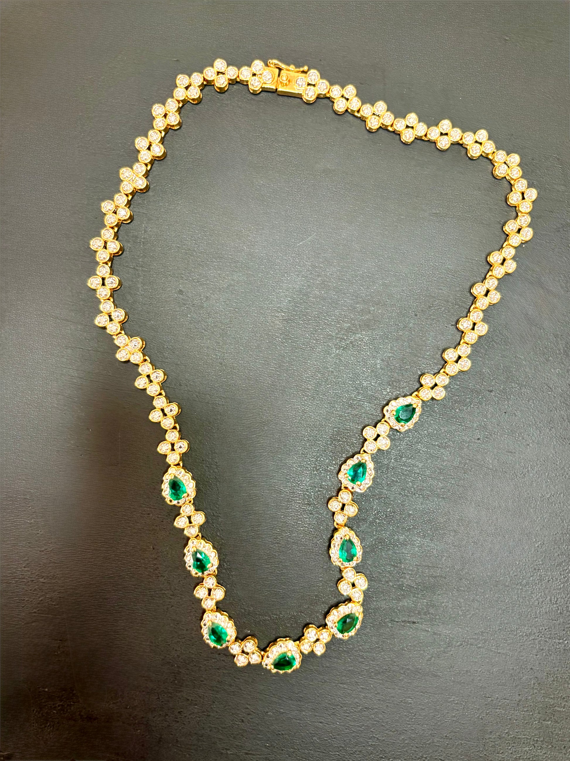 Elevate your collection with this exquisite JBK (Jacqueline Bouvier Kennedy Collection) necklace, inspired by the timeless elegance of America’s most iconic First Lady. This piece features brilliant emerald-green oval stones framed by sparkling clear crystals, all set in rich gold-tone metal for a luxurious, heirloom-quality finish.