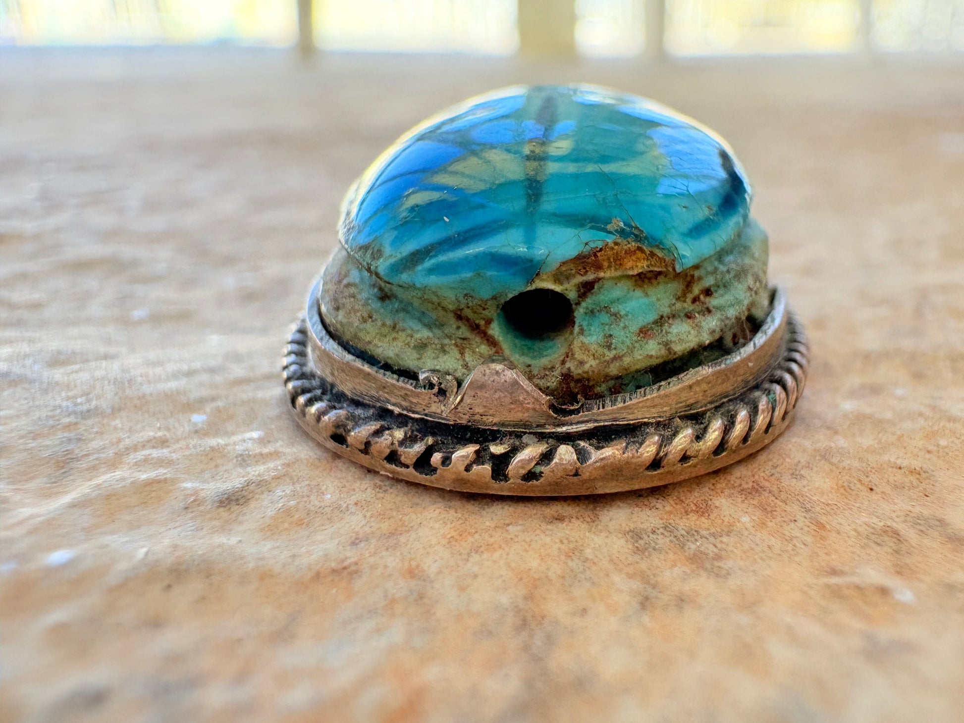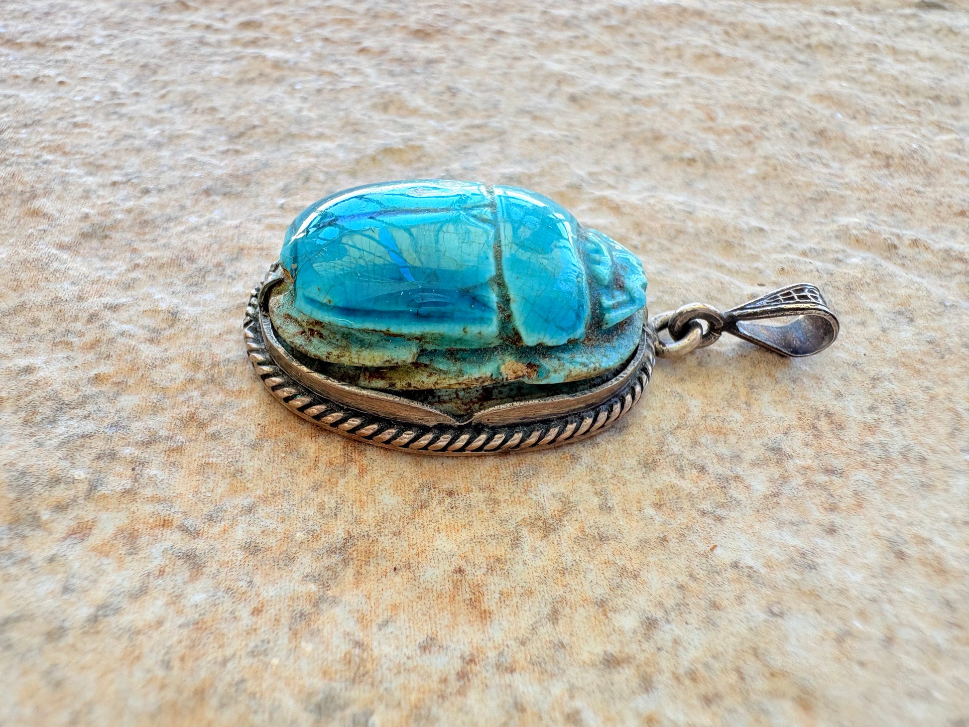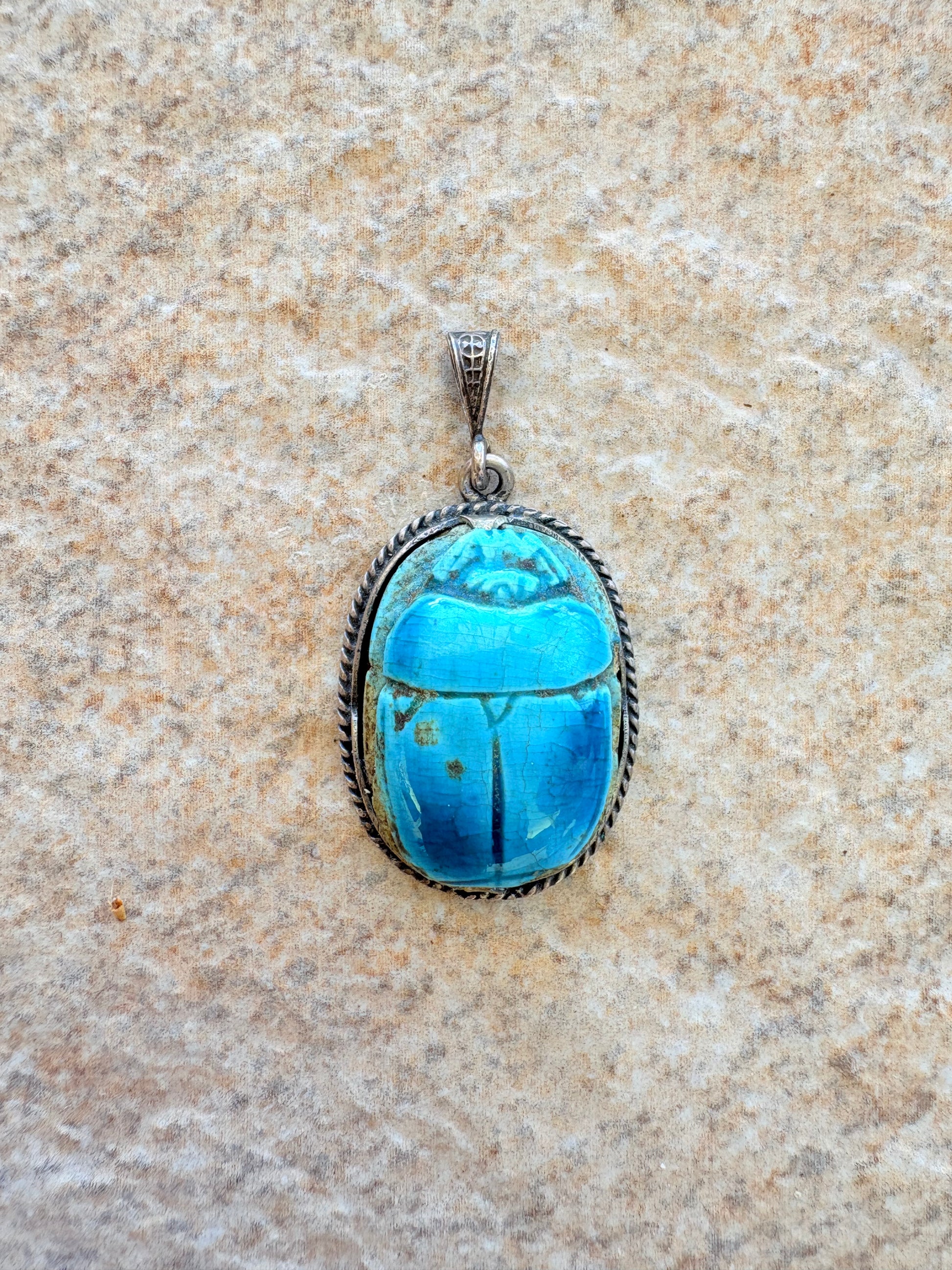 - Material: Faience-glazed ceramic scarab, Sterling Silver setting (stamped)