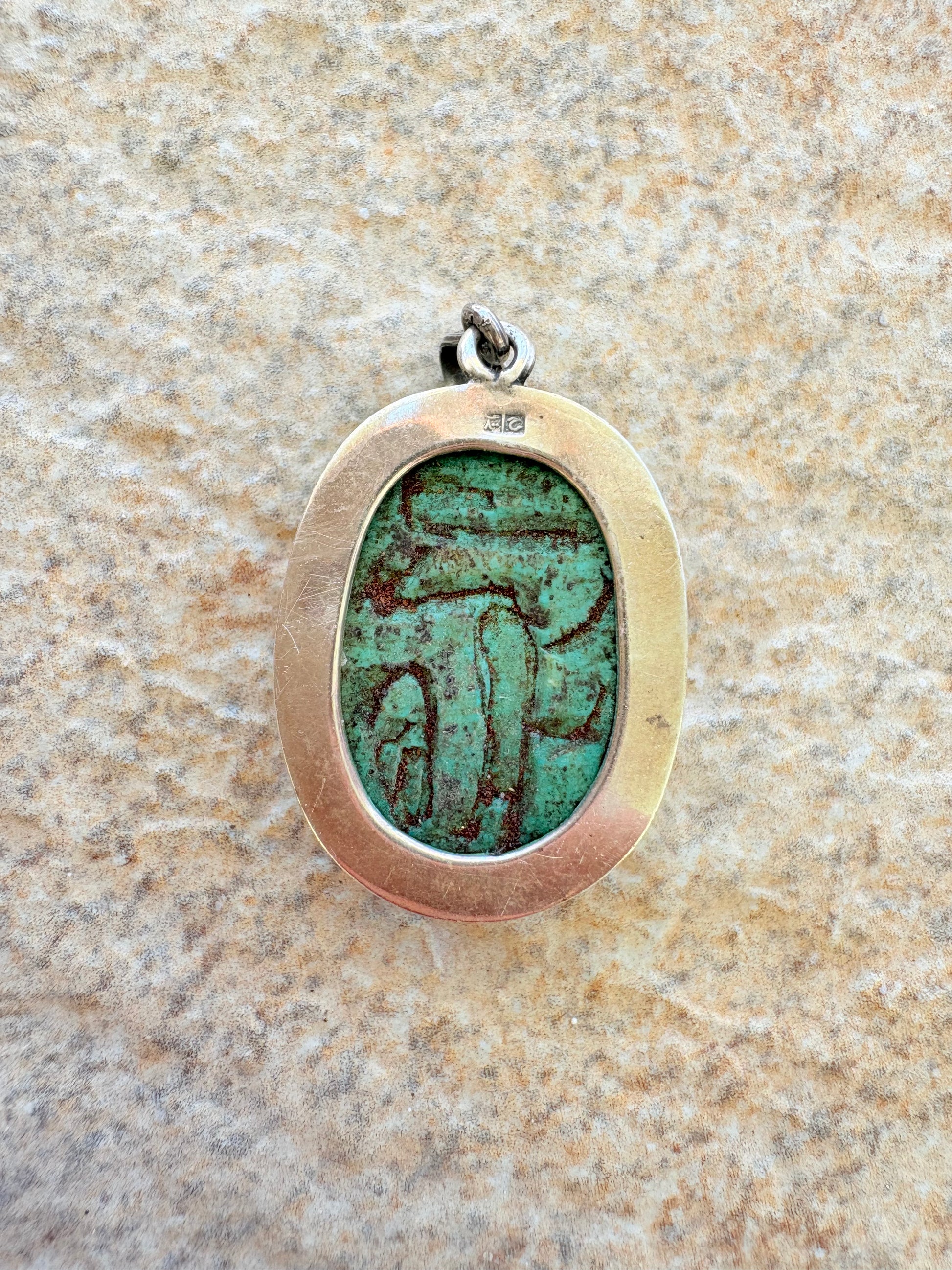 Vintage Egyptian Revival Scarab Pendant — Sterling Silver & Faience Glaze