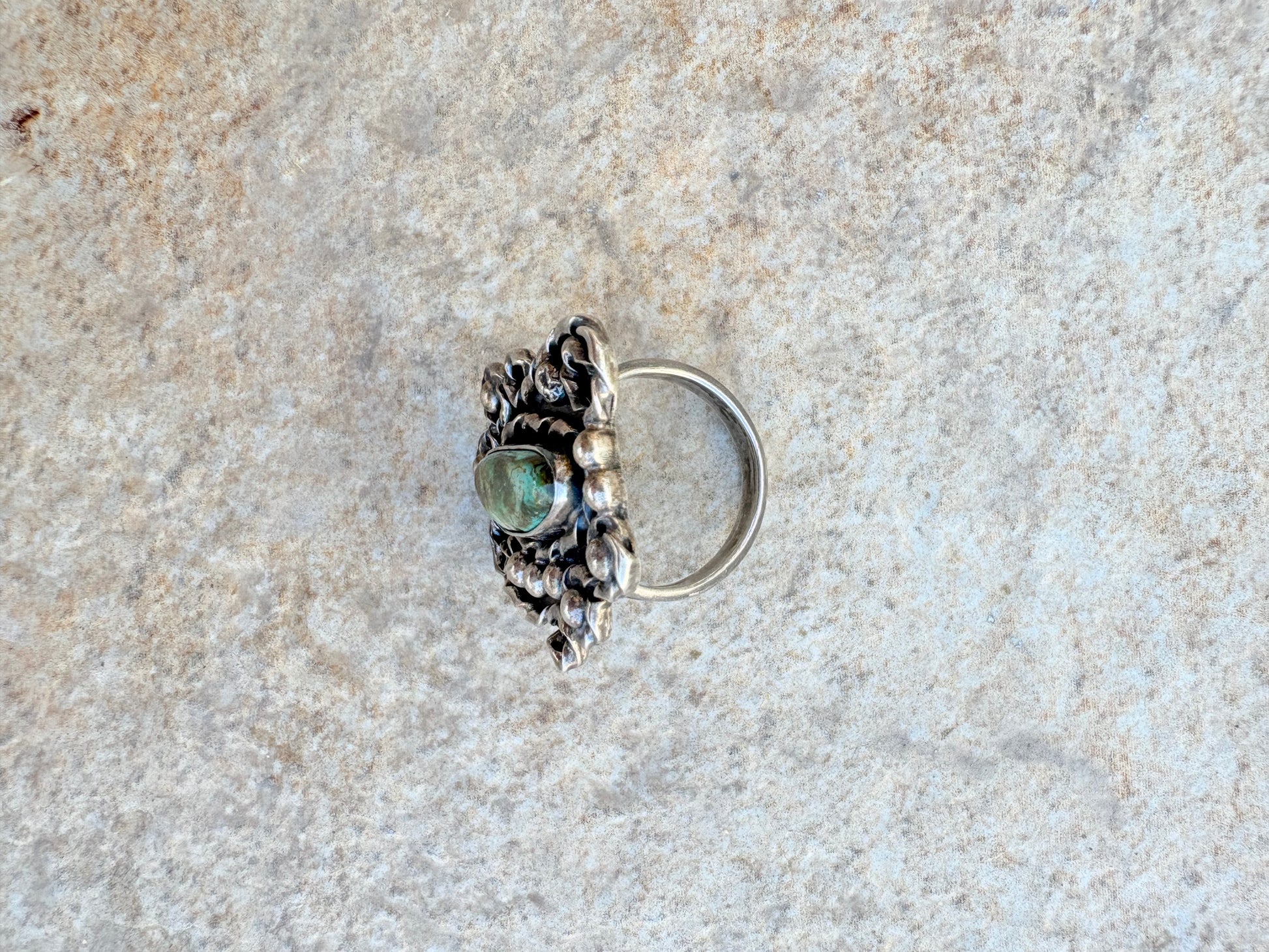 This striking vintage Native American ring is a true statement piece, showcasing bold artistry and craftsmanship. Handcrafted in sterling silver, the ring features an elongated green gemstone with natural matrixing, beautifully framed by organic repoussé and beadwork detailing. The sculptural design gives the piece both depth and texture, making it as much wearable art as it is jewelry.