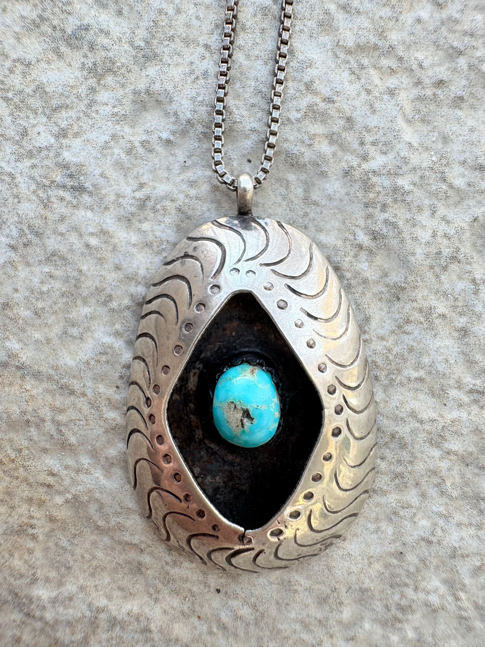 This vintage Navajo-made pendant features a striking shadowbox design, hand-stamped in sterling silver and set with a vibrant natural turquoise stone. The unique oval drop shape and radiating stamp work create a powerful, almost protective energy—evoking both mystery and strength. Hung on a sleek sterling silver box chain, this piece is ready to become your daily talisman or standout statement layer.