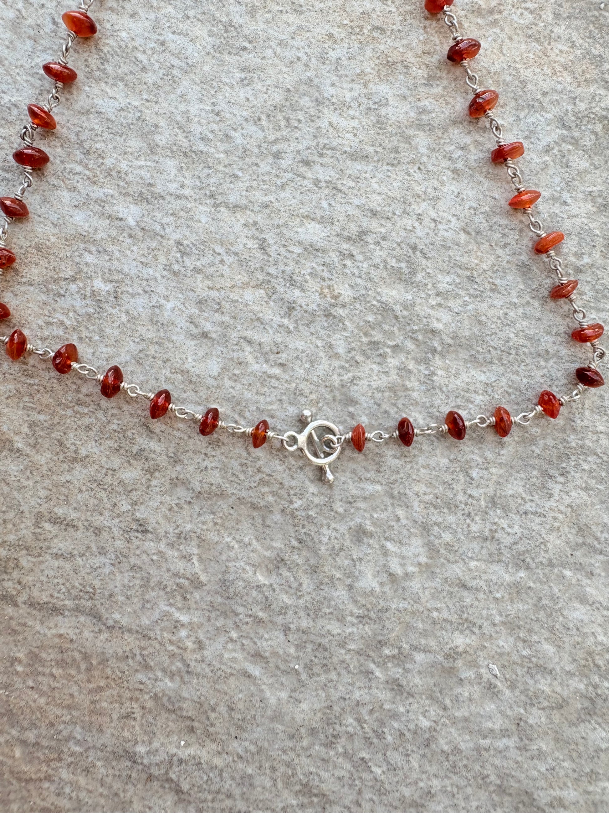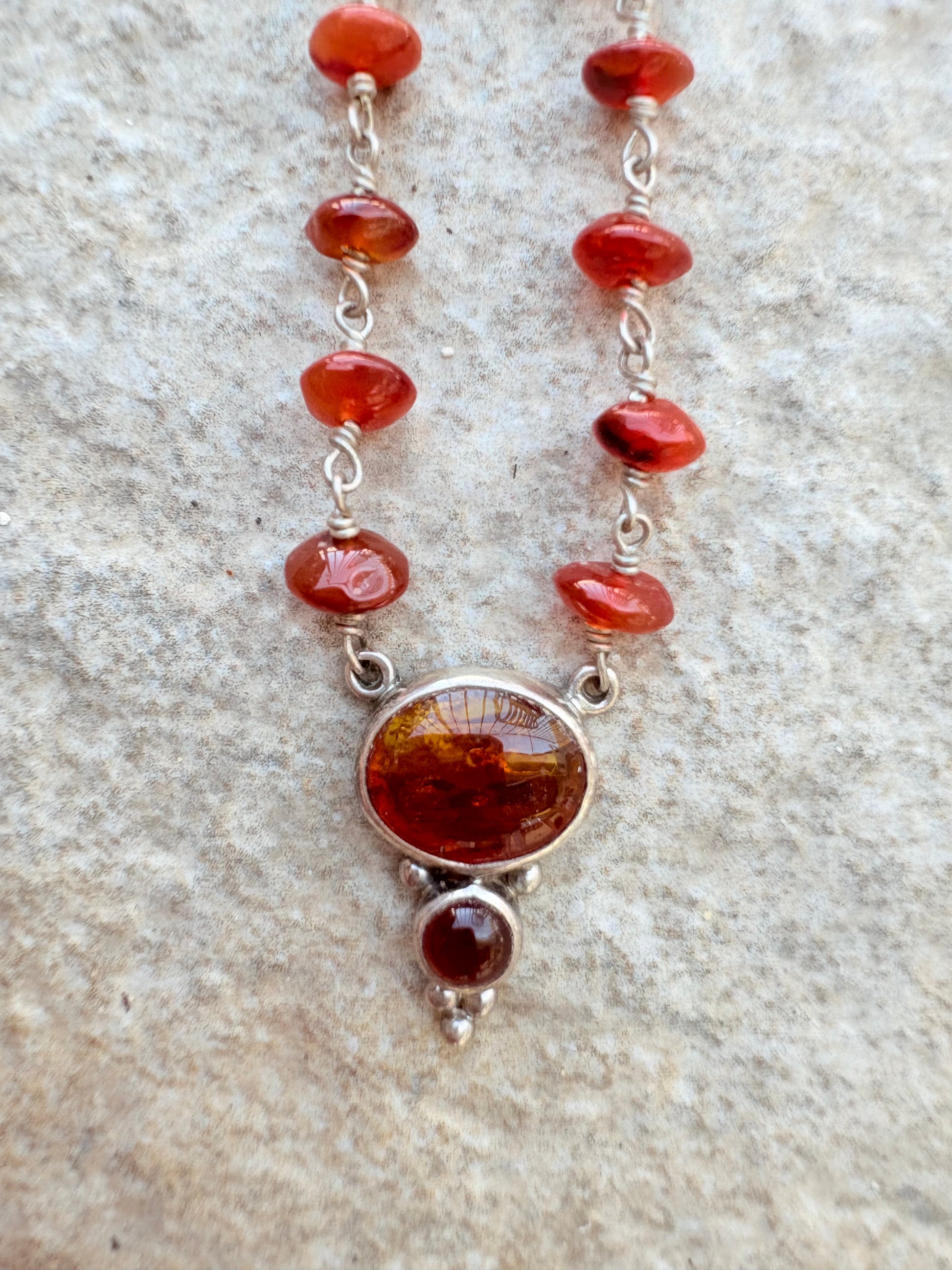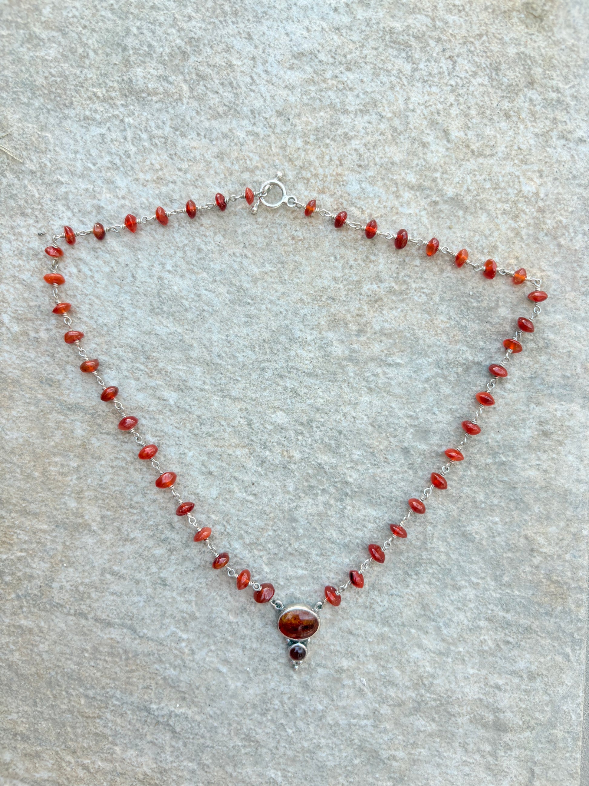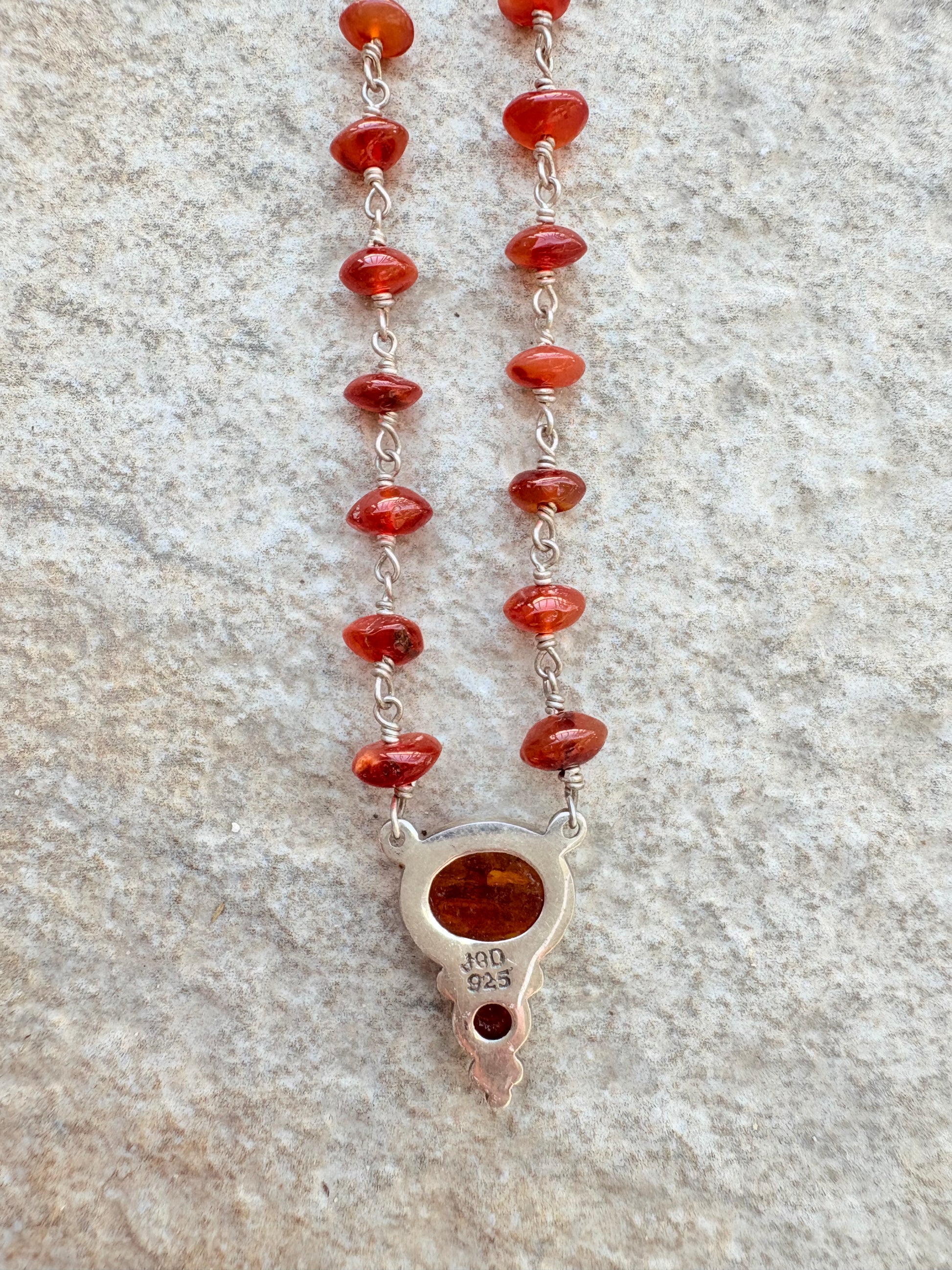 A fiery tribute to natural beauty, this vintage amber necklace features warm, honey-hued Baltic amber beads paired with a stunning sterling silver pendant set with polished amber cabochons. Each bead glows with a deep, organic luster, and the handcrafted silver detailing brings out the earthy elegance of the amber centerpiece. A beautiful statement piece for those drawn to timeless, nature-inspired treasures.